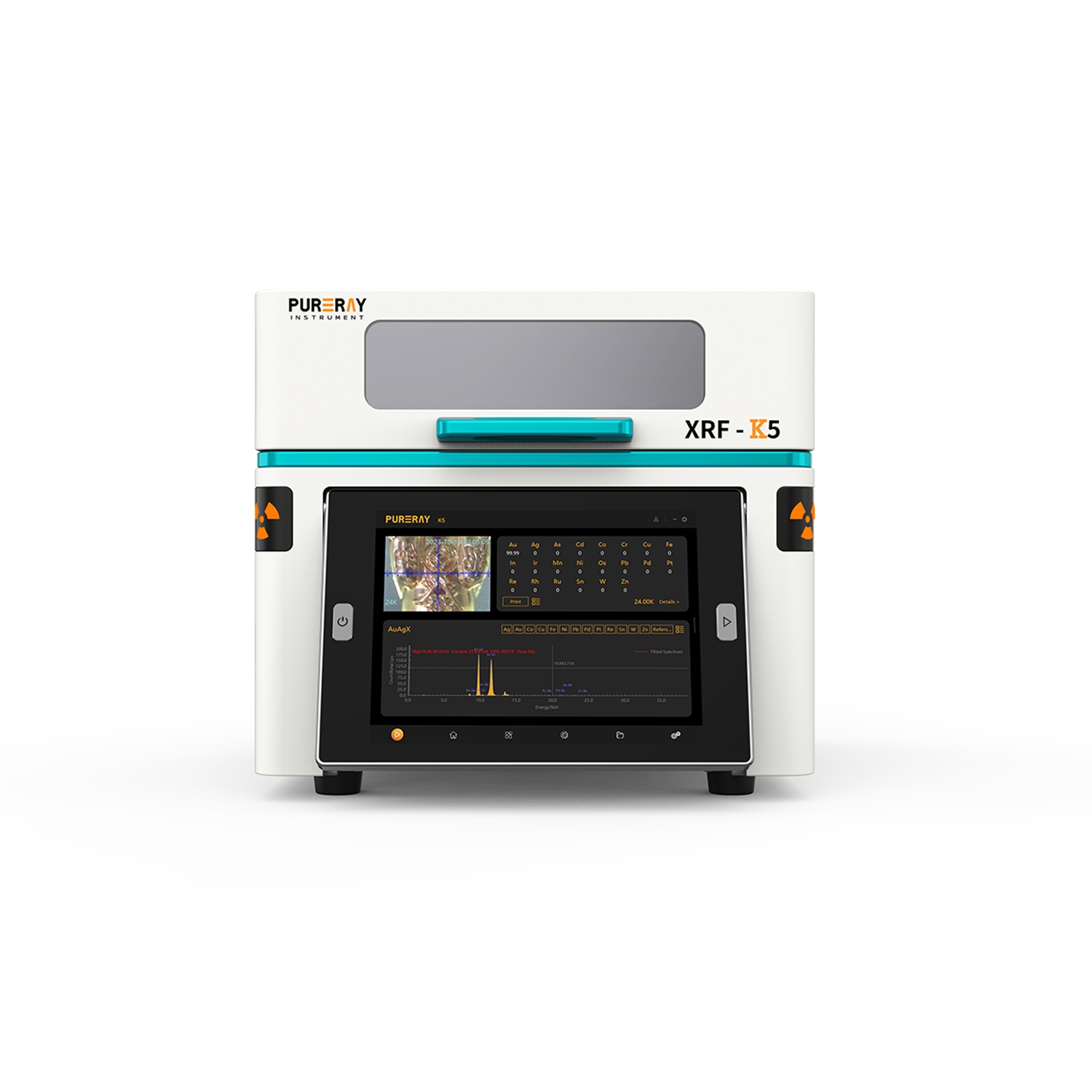 XRF-K5 precious metal analyzer is an X-ray fluorescence spectrometer made by PURERAY Instrument and which can be widely used in jewelry recycling, jewelry factories, hallmarking center, banks and other industries. The instrument adopts a USA AMPTEK Si-PIN detector, an embedded computer with a 10-core CPU and a touchscreen monitor. It applies the 45° angle optical path and the Smart FP algorithm. The cost-effective spectrometer provide the fast and accurate analysis.